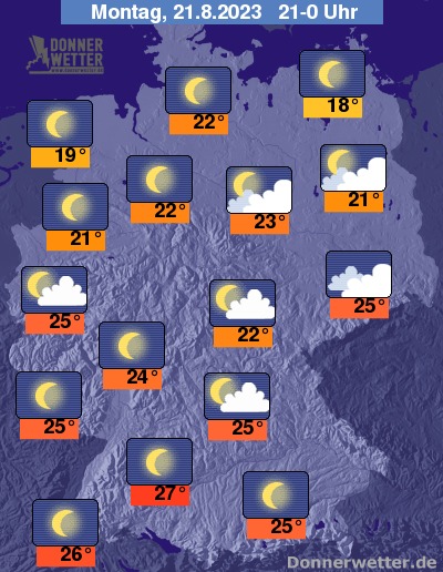 Am späten Abend ist der Himmel meist sternenklar oder nur gering bewölkt, dichtere Wolkenfelder können sich lokal vor allem über der Ost- und Südosthälfte bilden; es bleibt aber trocken.