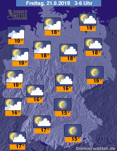 Am späten Abend und in der Nacht zeigt sich der Himmel über der Nordwesthälfte des Landes bedeckt oder aufgelockert bewölkt, in den übrigen Landesteilen dominiert ein anfangs sternenklarer, später nur locker bewölkter Himmel. Schauer sind in der Nacht nicht zu erwarten.