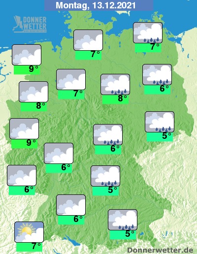 Am Montag bleibt der Himmel über weiten Landesteilen stark bewölkt oder es ist bedeckt, einzelne Auflockerungen beschränken sich vor allem auf den äußersten Südwesten. Im Osten und Südosten muss im Tagesverlauf immer wieder mit teils kräftigem Regen gerechnet werden, in der Westhälfte bleibt es meist trocken.