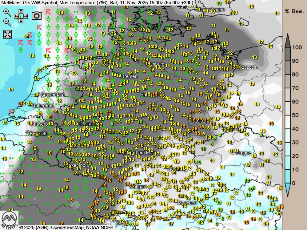 Die Wetter- und Temperaturkarte sowie die Temperaturabweichung für Samstagnachmittag (15:00 Uhr) nach GFS: