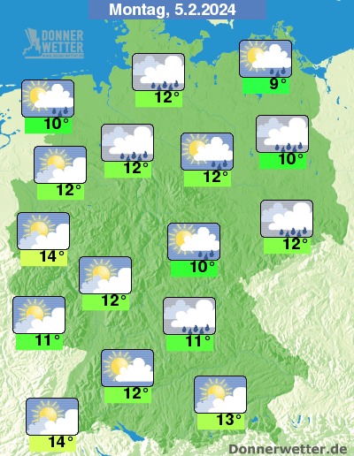 Am Montag zeigt sich der Himmel über dem Nordosten stark bewölkt oder es ist bedeckt und zeitweise fällt Regen. In den übrigen Landesteilen lockern die Wolken am Montag zunehmend auf, im Süden und Südwesten sind auch längere heitere Phasen möglich, und es bleibt überwiegend niederschlagsfrei. Im Norden und der Mitte weht ein weiterhin in Böen starker bis stürmischer Wind, auf den  Gipfeln auch Sturmböen.