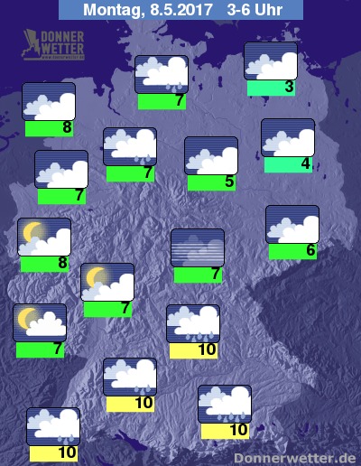 In der Nacht zum Montag klingen die Niederschäge über der Nordhälfte meist rasch ab und zum Teil lockert die Bewölkung hier auch auf, in der zweiten Nachthälfte ziehen von Schleswig-Holstein her jedoch neue Niederschläge heran. Im Süden bleibt es die Nacht über bedeckt und es fällt verbreitet Regen. Die Temperatur sinkt auf milde 10 Grad in Stuttgart und bis 3 Grad in Stralsund.