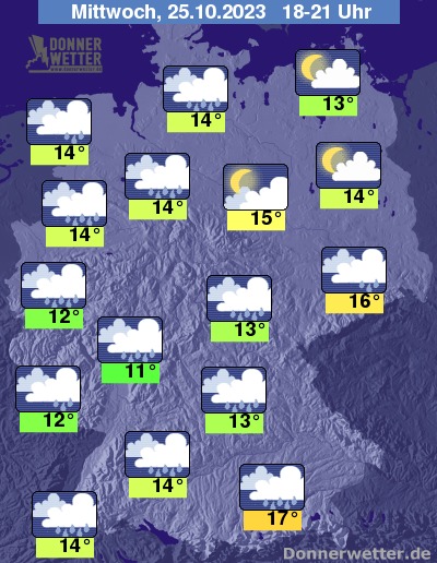 Heute Abend ist es im Nordosten anfangs noch teils locker bewölkt und trocken. Im übrigen Land ziehen verbreitet dichte Wolken durch und es fällt zeitweise, zum Teil auch kräftiger Regen. Die Temperatur liegt bei 11 Grad in Wiesbaden und 17 Grad in München.