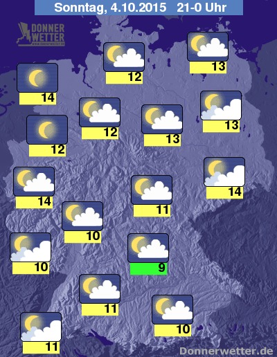 Heute Abend bleibt es im Osten oft stark bewölkt, in den übrigen Landesteilen zieht hingegen überwiegend nur lockere Bewölkung durch und teilweise ist der Himmel sogar klar. Von Südwesten her ziehen jedoch zunehmend dichterwerdende Wolken auf, es bleibt aber überall trocken. Die Abendwerte liegen bei 14 Grad in Görlitz und um 9 Grad in Mittelfranken.