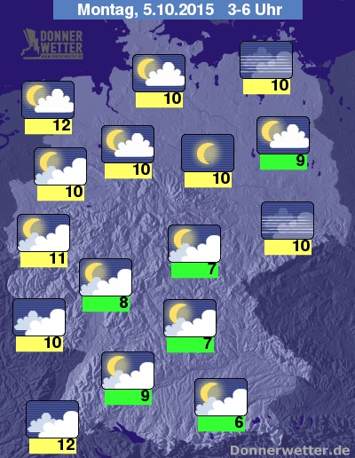 In der Nacht zum Montag bleibt der Himmel über dem Norden und Osten verbreitet locker bewölkt oder sternenklar und dabei trocken. In die Südwesthälfte Deutschlands ziehen hingegen viele und zunehmend auch dichte Wolken, dabei bleibt es jedoch weitgehend trocken. Die Temperatur sinkt auf 12 Grad in Freiburg und bis 6 Grad in Augsburg.