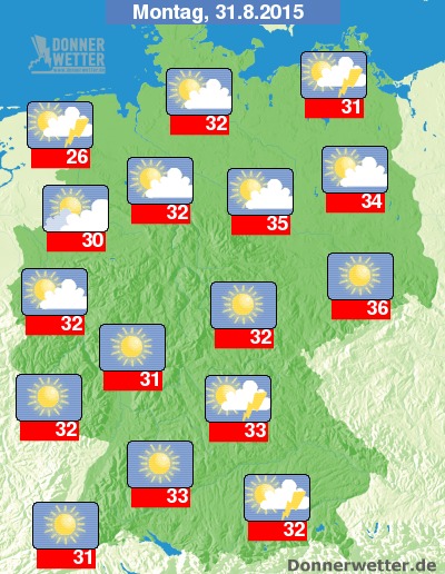Heute ziehen besonders in den küstennahen Regionen von Norddeutschland oft dichte Wolken durch und es können sich hier zeitweise Schauer und Gewitter entwickeln. Sonst ist es im Norden heiter oder wechselnd bewölkt, aber weitgehend trocken. Von der breiten Mitte bis nach Süddeutschland zeigt sich der Himmel verbreitet sonnig oder nur leicht bewölkt. Im Tagesverlauf zeigen sich jedoch gebietsweise auch dichter werdende Quellwolken und vor allem in den westlichsten Landesteilen, aber auch sonst steigt das Schauer- und Gewitterrisiko etwas an, größtenteils bleibt es jedoch trocken. Die Temperatur steigt auf 26 Grad an der Nordsee und auf drückend heiße 36 Grad in Dresden.