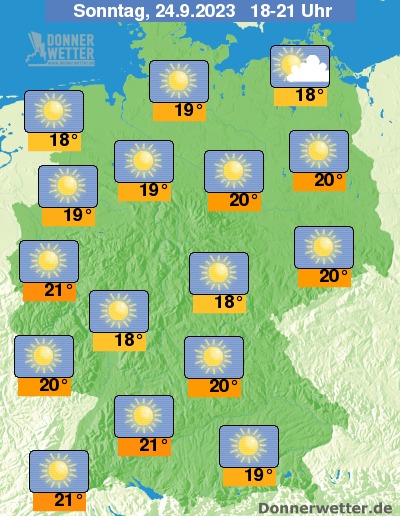 Heute Abend ist es überwiegend sonnig und nur selten ziehen mal ein paar Wolken durch, dabei bleibt es trocken. Die Temperatur liegt bei rund 18 Grad an den Küsten und 21 Grad am Oberrhein.