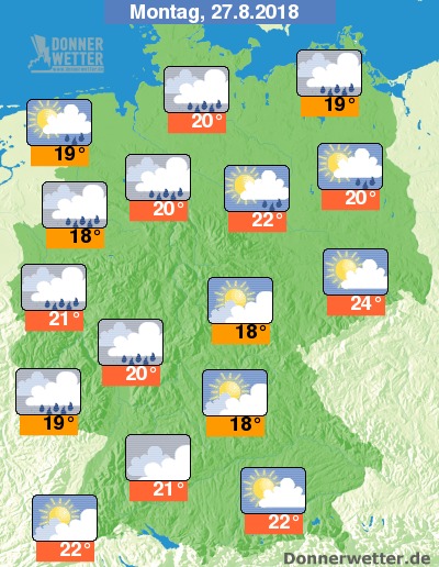 Die neue Woche startet verbreitet mit vielen und im Norden und Westen mit meist dichten Wolken und auch zeitweiligen Regenfällen. Im Süden und Osten scheint hingegen häufig die Sonne und hier bleibt es den Tag über auch weitgehend trocken. Die Temperatur steigt auf 18 Grad im Münsterland und bis 24 Grad in der Lausitz.