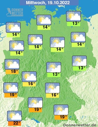 Am Mittwoch ist es größtenteils heiter oder sonnig, gebietsweise zieht auch starke Bewölkung durch oder es ist neblig-trüb. Es bleibt trocken bei 13 Grad in Rostock und bis zu 22 Grad in Freiburg.