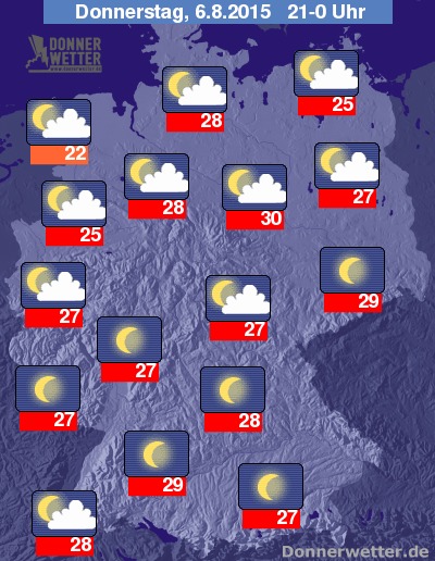 Heute Abend bleibt es über der Südhälfte von Deutschland verbreitet bei einem sternenklaren Himmel, im Südwesten ziehen nur hier und da einige Wolken durch, dabei bleibt es trocken. Im übrigen Bundesgebiet weiter im Norden ziehen meist lockere Wolken durch, oft ist es aber auch nur gering bewölkt und teils auch sternenklar, dabei bleibt es ebenfalls trocken. Die Abendtemperatur liegt bei noch heißen 30 Grad in Magdeburg und etwa 22 Grad an der Nordseeküste.