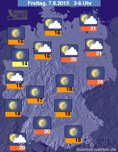 In der Nacht zum Freitag ziehen im Westen und im Südwesten gebietsweise dichte Quellwolken auf, die für einzelne Schauer und regional kräftige Gewitter sorgen können, zumeist bleibt es jedoch trocken und auch leicht bis aufgelockert bewölkt. Im Norden ist es ebenfalls meist leicht oder aufgelockert bewölkt und dazu trocken. In den übrigen Landesteilen ist es sogar weitgehend sternenklar und ebenso trocken. Die Temperatur sinkt auf 24 Grad in Dresden und bis 14 Grad am Niederrhein.