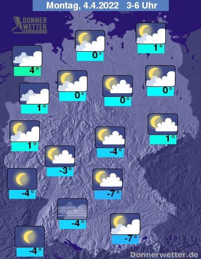 In der bevorstehenden Nacht ist es im Norden schon oft stark, teils noch aufgelockert bewölkt. Weiter nach Süden hin zeigt sich der Himmel verbreitet locker bewölkt, vor allem im Süden auch sternenklar. Es bleibt zunächst überall trocken. Von Nordwesten nimmt die Bewölkung aber immer weiter zu und gegen Morgen fällt im Nordwesten erster Regen, sonst bleibt es trocken. Die Temperatur sinkt auf 4 Grad an der Nordsee und bis -7 Grad in Mittelfranken.