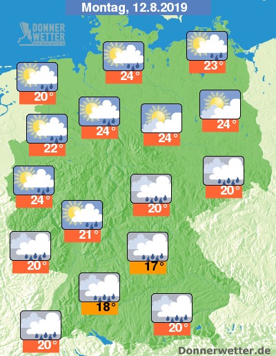 Am Montag präsentiert sich das Wetter überwiegend stark bewölkt, im Westen und Norden zeigen sich gebietsweise zwar heitere Abschnitte, jedoch bilden sich hier ebenso zeitweise Schauer und lokale Gewitter. Über dem Süden und über Sachsen fällt unter dichten Wolken zeitweise Regen, im Rest der Republik bleibt es hingegen trocken. Die Temperatur steigt auf 17 Grad in Mittelfranken und bis 24 Grad in der Kölner Bucht.