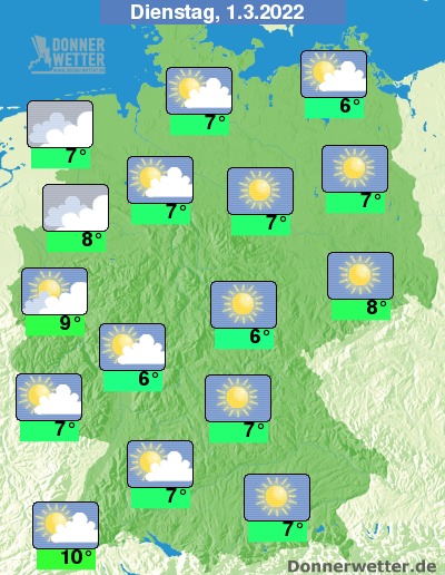 Am Dienstag ist es besonders im Süden und Osten noch überwiegend sonnig, ansonsten nimmt die Bewölkung von Nordwesten her aber nach und nach zu und im Verlauf ziehen auch dichte Wolken auf. Es bleibt landesweit trocken bei Höchstwerten von 6 Grad in Erfurt und bis 10 Grad in Freiburg.