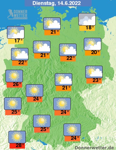 Am Dienstag ist es im Norden oft stark, teils auch aufgelockert bewölkt. Im großen Rest der Republik ist es überwiegend heiter bis sonnig. Es bleibt landesweit trocken bei Höchstwerten von 17 Grad an der Nordsee und bis 28 Grad im Oberrheingraben.