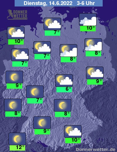 In der kommenden Nacht zeigt sich der Himmel verbreitet nur locker bewölkt oder sternenklar. Im Norden ziehen jedoch oft viele und gebietsweise dichte Wolken durch. Es bleibt überall trocken bei Tiefstwerten von 12 Grad im Breisgau und etwa 6 Grad im Vogtland.
