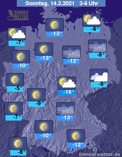 In der kommenden Nacht klingen auch die Schneefälle über Sachsen nach und nach ab, jedoch bleibt es hier oft stark bewölkt. Im übrigen Land ist es hingegen meist sternenklar, wobei gegen Morgen im Westen und Nordwesten zum Teil dichte Wolken aufziehen können, dazu bleibt es trocken. Die Temperatur sinkt auf -5 Grad in Aachen und bis auf eisige -16 Grad in Jena.