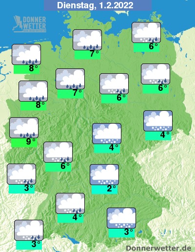 Am Dienstag ziehen dichte Wolken durch, dabei fällt über der Süden und Osten häufig Schnee, sonst überwiegend Regen. Die Temperatur steigt auf nasskalte 2 Grad in Nürnberg und bis zu 9 Grad in der Kölner Bucht, Vor allem über dem Norden weht zudem ein oft stürmischer Wind, an der See herrscht zum Teil Sturm.