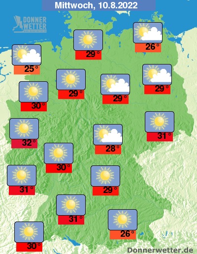 Am Mittwoch ist es verbreitet heiter oder sonnig, dabei bleibt es trocken. Die Temperatur steigt auf 25 Grad an der Nordsee und bis 32 Grad im Rheinland.