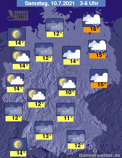 In der Nacht zum Samstag klingen letzte Schauer rasch ab und der Himmel lockert und klart verbreitet auf. Besonders in den östlichen Landesteilen ist es aber auch noch teils stark bewölkt. Die Temperatur sinkt auf 16 Grad in Stralsund und bis etwa 10 Grad in Jena.
