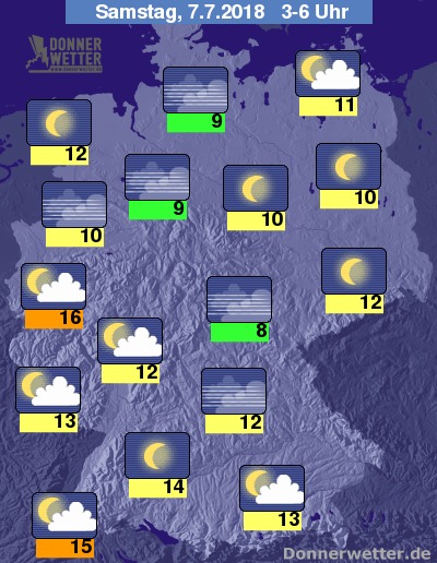 In der kommenden Nacht sind am Alpenrand anfangs noch einzelne Schauer möglich, sonst ist der Himmel über dem Bundesgebiet dagegen locker bewölkt oft auch sternenklar, dazu bleibt es trocken. Die Temperatur sinkt auf 16 Grad in Köln und bis 8 Grad im Grabfeld.
