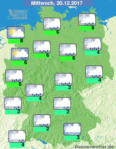Am Mittwoch ist es am Niederrhein und im Emsland oft locker oder aufgelockert bewölkt und dabei trocken. Im großen Rest der Republik bleibt es hingegen weitgehend bedeckt und es fällt immer wieder Regen, im Süden meist Schnee oder Schneeregen. Die Temperatur steigt auf 2 bis 8 Grad.