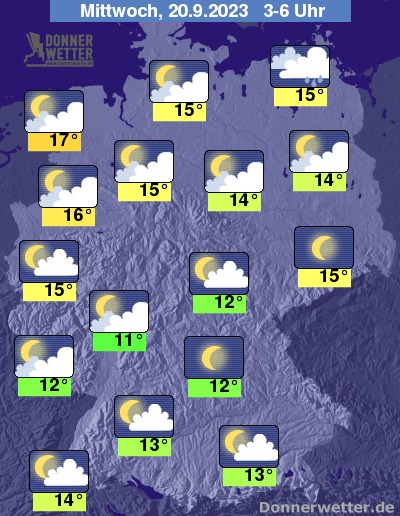 In der folgenden Nacht ziehen im Norden gebietsweise dichte Wolken mit etwas Regen durch. Über der Südosthälfte des Landes ist es locker bewölkt und teilweise sternenklar, dazu trocken. Im übrigen Land ist es aufgelockert oder stark bewölkt, aber ebenso trocken. Die Temperatur sinkt auf 17 Grad an der Nordsee und bis 11 Grad am Westerwald.