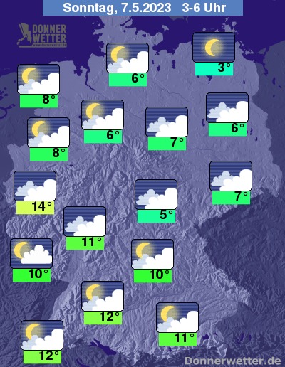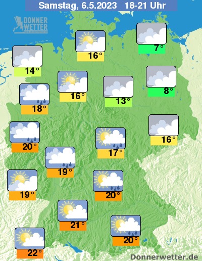 Am Sonntag ist es in den westlichen Landesteilen, sowie im Südwesten und äußeren Süden bedeckt und es fällt häufig Regen, örtlich können sich auch Gewitter entwickeln. Im übrigen Land ist es aufgelockert bis stark bewölkt und dazu weitgehend trocken. Direkt an der Ostsee ist es verbreitet heiter bis sonnig und trocken. Die Temperatur steigt auf 11 Grad in der Lausitz und bis 22 Grad im Raum München.