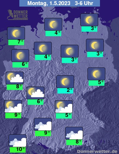 In der Nacht zum Montag zeigt sich der Himmel etwa nördlich des Mains verbreitet sternenklar. Weiter nach Süden hin dagegen weitgehend stark bis dicht bewölkt. Gegen Morgen ist im südlichen Bayern auch Regen möglich, ansonsten bleibt es trocken. Die Temperatur sinkt auf 10 Grad in Freiburg und 2 Grad in Jena.