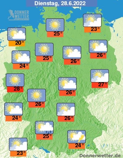 Am Dienstag bleibt es über dem Süden stark, über Sachsen oft stark bewölkt, dabei bleibt es aber zumeist trocken. In Alpennähe ist jedoch mit einzelnen Schauern und Gewittern zu rechnen. Im übrigen Land ist es verbreitet heiter bis sonnig und trocken. Die Temperatur steigt auf 20 Grad an der Nordsee und bis 28 Grad in der Kölner Bucht.