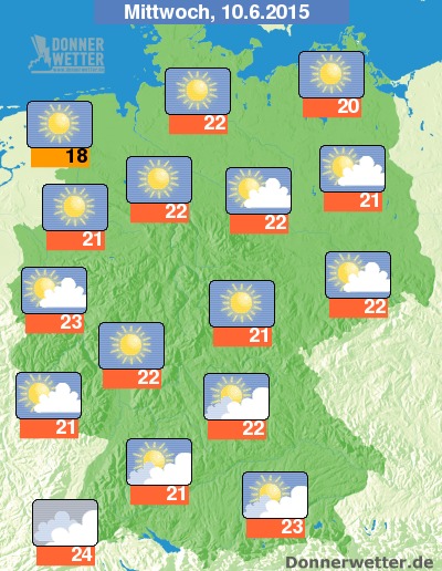 Die Höchsttemperaturen steigen im Tagesverlauf auf Werte um 18 Grad C auf den Ostfriesischen Inseln und um 24 Grad C am Oberrhein.