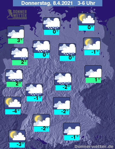 In der Nacht zum Donnerstag ist es im Südwesten des Landes und von Vorpommern bis nach Berlin oft gering bis wechselnd bewölkt und trocken. Im übrigen Bundesgebiet ist es meist dicht bewölkt und mit Ausnahme des Südens fällt zeitweise Regen, Schneeregen oder Schnee. An den Küsten weht ein starker bis stürmischer Wind. Die Temperatur sinkt auf 3 Grad an der Nordsee und bis -4 Grad im Saargau.