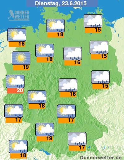 Am Dienstag ist es zunächst oft stark bewölkt und es fällt zeitweise Regen. Von Westen her lockert die Bewölkung jedoch mehr und mehr auf und die Sonne kann sich immer besser zeigen, nachfolgend bleibt es dann trocken. Am Abend bilden sich nur noch in den östlichen Landesteilen gebietsweise Schauer. Die Temperatur steigt auf 15 Grad im Vogtland und bis 20 Grad in Düsseldorf.