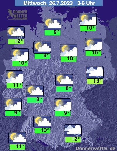 In der folgenden Nacht zeigt sich der Himmel lange Zeit nur locker bewölkt oder sternenklar. Im Alpenvorland, über Sachsen und an der Nordsee bilden sich bei oft dichten Wolken jedoch gebietsweise Schauer, sonst bleibt es überwiegend trocken. Die Temperatur sinkt auf 13 Grad in Dresden und etwa 8 Grad in Wiesbaden.