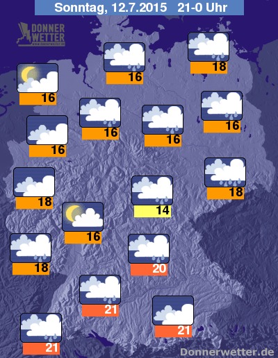 Heute Abend präsentiert sich der Himmel verbreitet stark und nur hier und da auch aufgelockert bewölkt, dazu fällt auch zeitweise Regen. Am ehesten trocken bleibt es von Rheinland-Pfalz bis nach Hessen. Die Abendtemperatur liegt bei 21 Grad am Bodensee und etwa 14 Grad im Grabfeld.