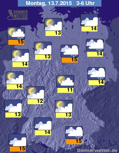 In der Nacht zum Montag zeigt sich der Himmel aufgelockert oder stark bewölkt, dabei fällt vor allem im Osten, aber auch im Norden und am Alpenrand gebietsweise Regen, sonst bleibt es überwiegend trocken. Die Temperatur sinkt auf 15 Grad in Magdeburg und bis 11 Grad am Thüringer Wald.