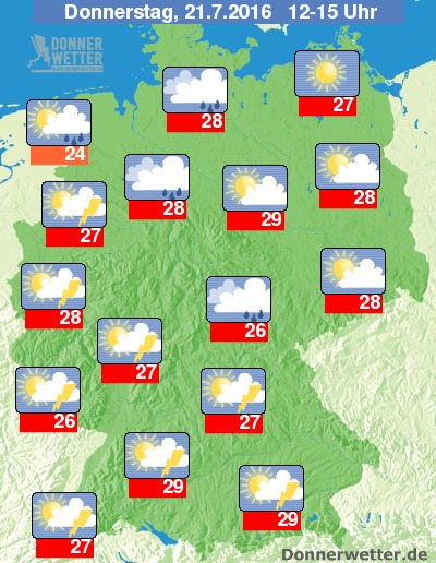 Heute Nachmittag scheint zwischen der Ostseeküste und Berlin-Brandenburg häufig die Sonne und es bleibt hier weitgehend trocken. Im übrigen Bundesgebiet zeigen sich zum Teil Auflockerungen, jedoch ziehen oft auch dichte Wolken durch, dabei sind verbreitet Schauer und teils kräftige Gewitter möglich. Die Temperatur steigt auf 24 Grad an der Nordsee und bis 29 Grad in Magdeburg.