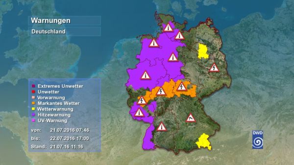 Aktuell sind für weite Teile Niedersachsens und Nordrhein-Westfalens Hitzewarnungen aktiv. Schwül-warme Temperaturen erwarten zudem den Südwesten des Landes.