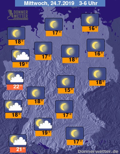 Die Luft kühlt zu den Frühstunden auf 15 bis 19 Grad ab. In den Ballungsgebieten des Westens, im Breisgau, sowie auf einigen Hügelkuppen bleibt es mit Werten von knapp über 20 Grad tropisch.