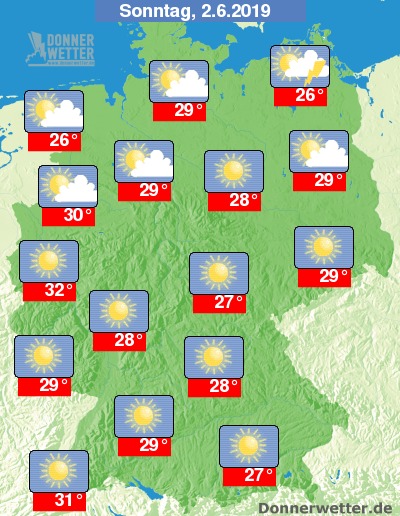 Am Sonntag erwartet uns wieder verbreitet heiteres bis sonniges und dabei trockenes Wetter. Die Temperatur steigt auf 26 Grad in Rostock und bis 32 Grad in Köln.