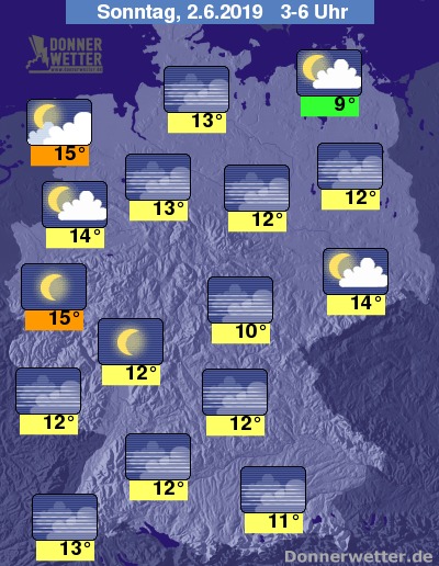 In der Nacht zum Sonntag klingen letzte Schauer und Gewitter im Südosten rasch ab und der Himmel klart auch hier, wie schon in der übrigen Republik verbreitet auf. Im Norden und vor allem an den Küsten können allerdings auch einige Wolken durchziehen. Es bleibt landesweit trocken bei Tiefstwerten von 15 Grad am Niederrhein und bis 9 Grad in Vorpommern.