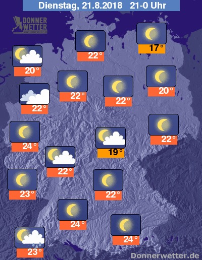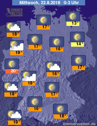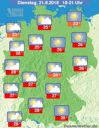 Zum abendlichen Sonnenuntergang ist der Himmel meist nur leicht bis mäßig von Wolken überzogen. Nur vereinzelt tröpfelt es, oder es gehen schwache Schauer nieder. Im äußersten Südwesten und an den Alpen könnte es vielleicht irgendwo ein Gewitter geben. Die Temperaturen bewegen sich immer noch zwischen 23 Grad an den Küsten und nahe 30 Grad im Süden und am Rhein.