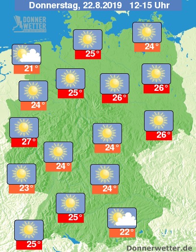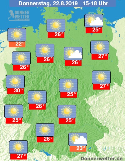 Die Temperaturen legen im Vergleich zu gestern nochmals zu und erreichen im Nachmittagsverlauf Höchstwerte um 22 Grad an der Nordseeküste und um 30 Grad im Rheinland.