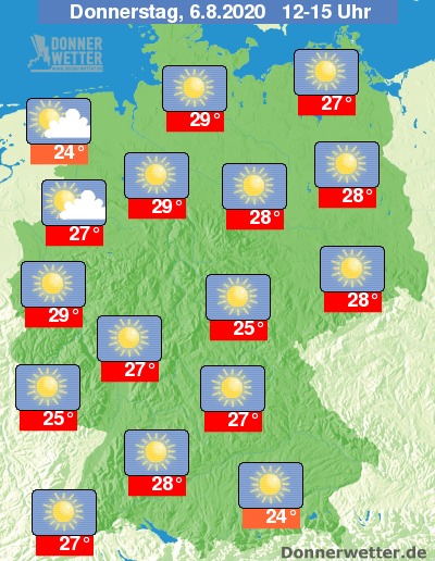 Die Temperaturen steigen auf Werte meist um 26 bis 29 Grad Grad, im Westen wird mit Werten bis 32 Grad auch Hitzetag-Niveau erreicht.