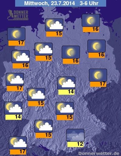In der kommenden Nacht klingen auch die Schauer im äußersten Süden nach und nach ab, sonst ist es bereits meist locker oder aufgelockert bewölkt und trocken. Vor allem im Osten und Nordosten zeigt sich auch ein häufig sternenklarer Himmel. Die Temperatur sinkt auf 17 Grad im Rheinland und etwa 12 Grad im Allgäu.