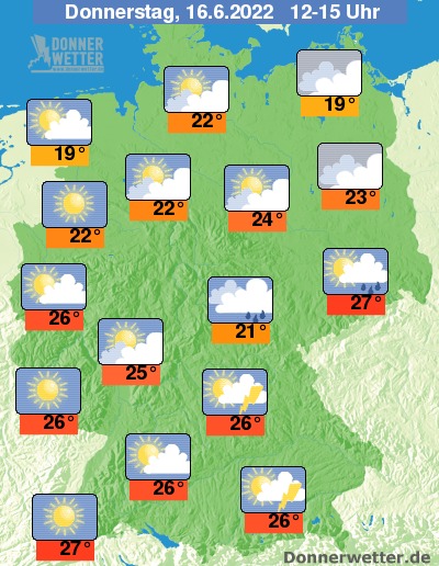 Heute Nachmittag ist es häufig heiter oder sonnig, besonders über der Osthälfte der Republik ziehen auch gebietsweise dichte Quellwolken hinweg, dabei sind lokale Schauer und Gewitter möglich. Im übrigen Land bleibt es weitgehend trocken bei Werten von 19 Grad an den Küsten und etwa 27 Grad in der Lausitz.