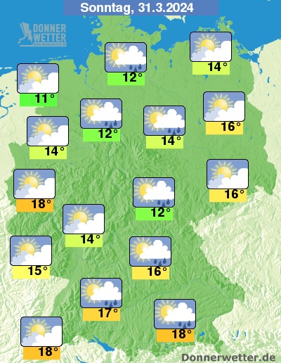 Am heutigen Ostersonntag zeigen sich oft heitere Abschnitte, zum Teil ziehen einige, vor allem im Süden auch dichte Wolken durch, dabei ist auch etwas Regen möglich. Zum Großteil bleibt es über der Bundesrepublik aber trocken. Die Temperatur erreicht 11 Grad auf den Nordseeinseln und bis 18 Grad in Oberbayern.