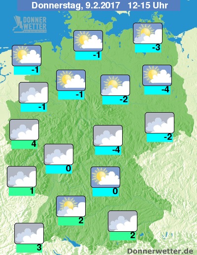 Dabei liegen die Höchstwerte zwischen -4 Grad im Thüringer Wald und +4 Grad am Niederrhein.