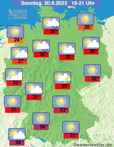 In den Abenstunden bleibt es weiterhin verbreitet heiter oder die Sonne scheint von einem wolkenlosen Himmel. In der Nord- und Osthälfte sind einzelne Hitzegewitter möglich, in den übrigen Landesteilen bleibt es am Abend niederschlagsfrei.
