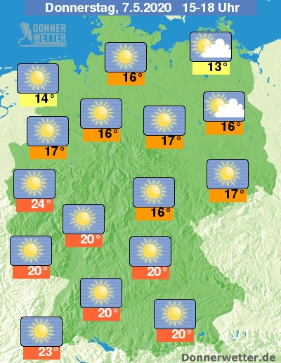 Die Temperaturen bewegen sich allgemein zwischen 15 und 20 Grad, etwas kühler bleibt es an den Küsten von Nord- und Ostsee, sowie unter den dichten Wolken in Brandenburg, angenehm warm wird es in den Ballungsgebieten des Westens.